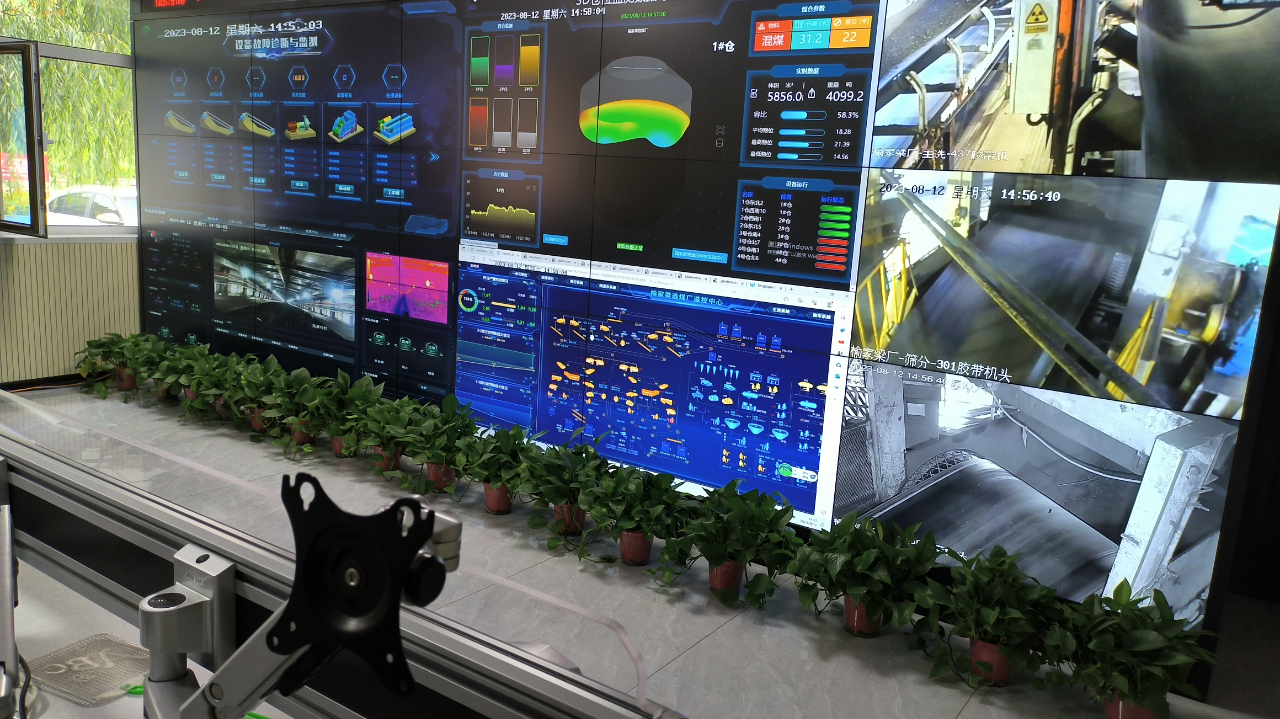 只见它在轨道上移动,,通过转动底部的云台,,,“盯”着输煤栈桥区域里的皮带机设备。。。而在百米之外的选煤厂调度室,,,,正实时显示着“它”看到的画面。。。
