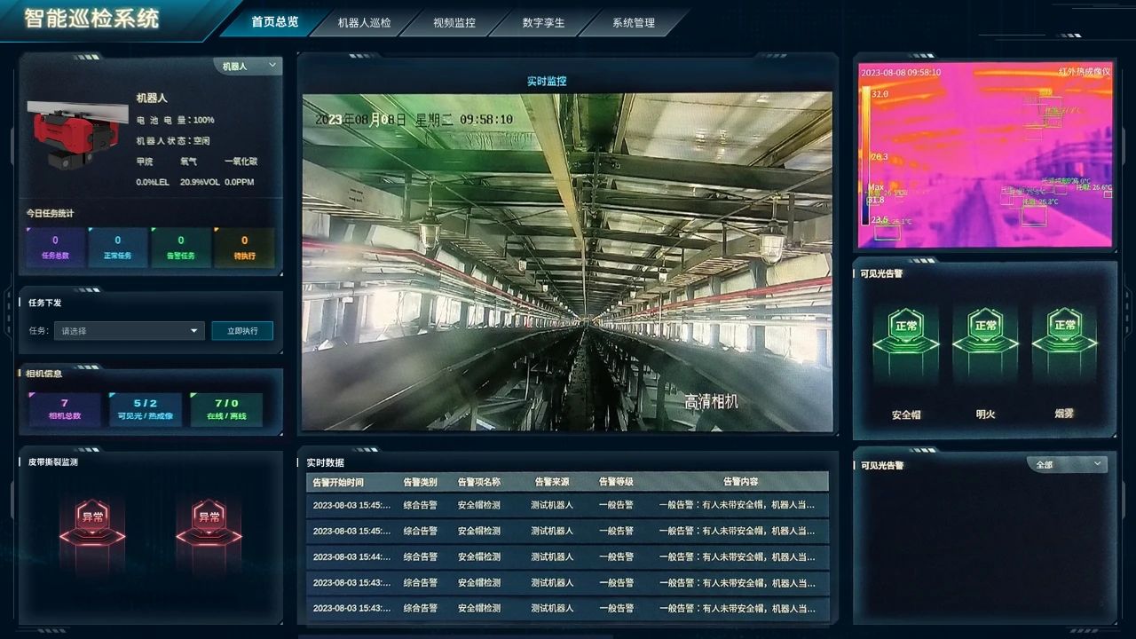 相较于以往传统人工巡检,,,,天创智能机器人的应用,,,,有效提升了巡检的效率,,,,解决了长期以来人工巡检不安全、、效率低、、、、劳动强度大、、、、巡检结果差异化大等问题,,为选煤厂运输系统筑起了“智慧防线”。。同时,,,通过系统后台立体可视化的呈现形式,,,,确保实时全面监测栈桥内的设备状态、、、、环境信息、、、、人员行为等情况,,并输出数字化巡检报告,,便于结果追溯,,形成趋势化数据,,,支撑设备预测性维护。。。