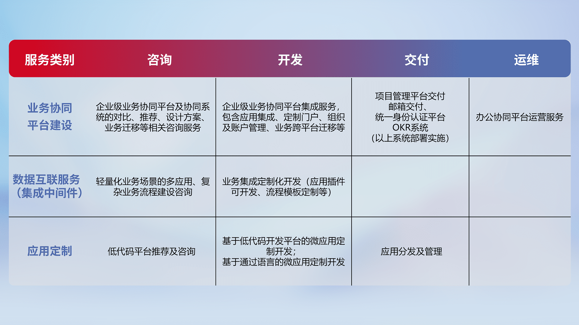 针对钉钉、、企微、、、IDaas等平台级产品提供产品的规划、、、、方案、、交付、、定制化开发等服务,,,,实现如统一协同办公、、、、智能客户服务、、、混合会议管理、、、、智能数据查询、、、等业务场景,,实现数字化转型。。。。