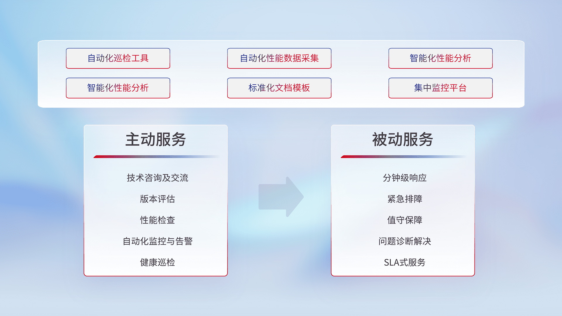 智能化工具和标准化文档,,,保障服务质量,,,提供主动服务(包含技术咨询、、、版本评估、、性能检查、、、自动化监控与告警、、健康巡检)和被动服务包含(分钟级响应、、紧急排障、、、值守保障、、问题诊断解决、、、、SLA服务)。。。。
